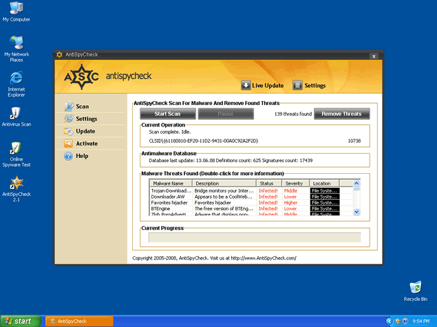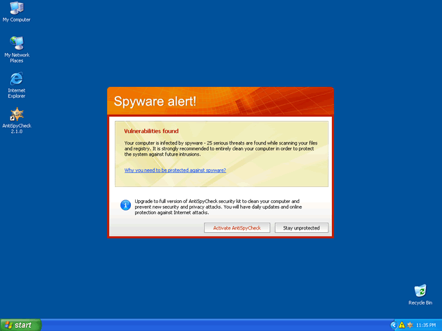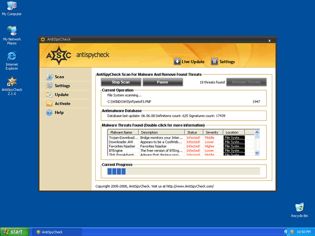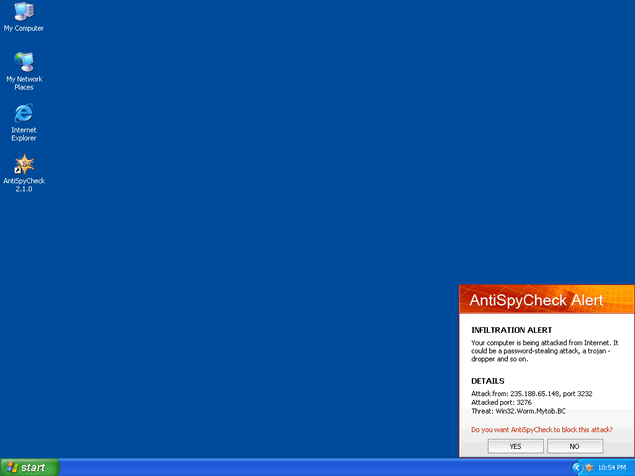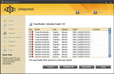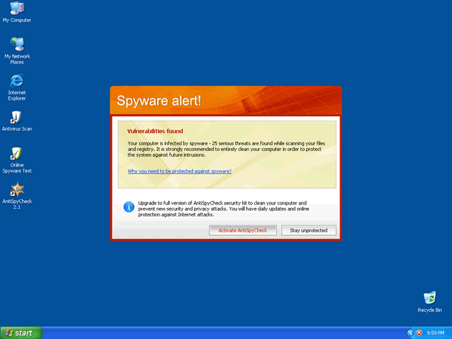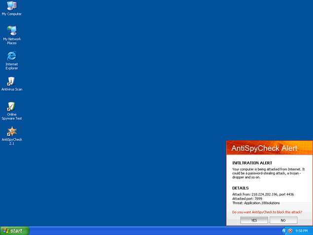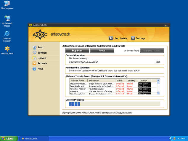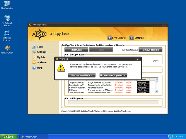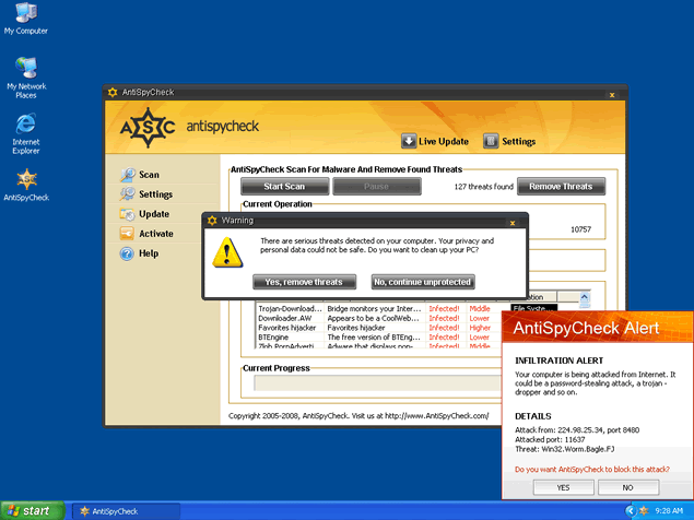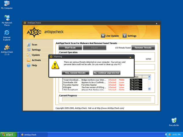 AntiSpyCheck, or AntiSpyCheck 2.4, is a rogue anti-spyware program that alleges to be a spyware remover, popup blocker and spam filter. AntiSpyCheck may download and install without your knowledge or consent through a Trojan called Zlob. AntiSpyCheck may pop up fake security alerts in order to trick you into purchasing their software. AntiSpyCheck's activities may generate a system slowdown.