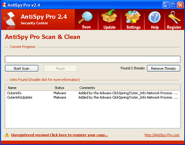 AntiSpyPro is a rogue anti-spyware application, which is primarily created to lure Internet users out of their money. Usually, AntiSpyPro is downloaded and installed by a Trojan Zlob, through browser security holes or via other illicit mechanisms. Once it is executed, you will be bombarded with hundreds of fake Warning messages and popups looking like real Windows alerts in your system tray and claiming that your PC is infected with spyware. Once you click on this message, you will be directed to AntiSpyPro's home site where you will be tricked into purchasing the commercial version of AntiSpyPro rogue anti-spyware application. In addition, AntiSpyPro may cause sluggish performance of your computer.