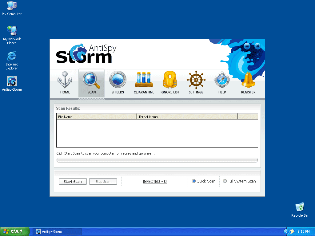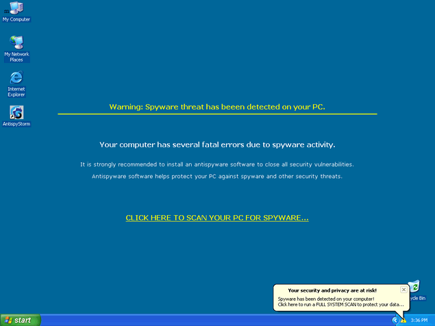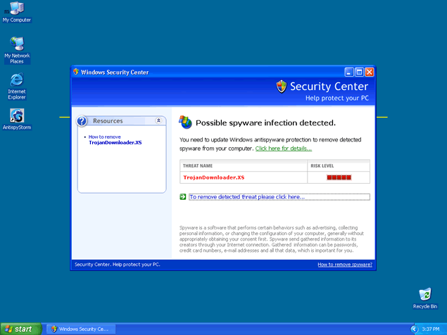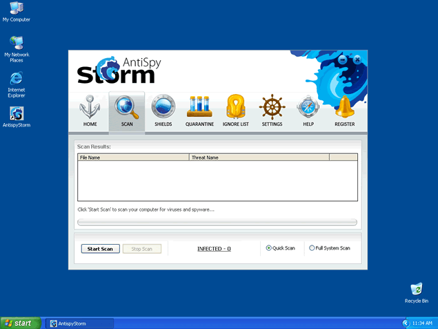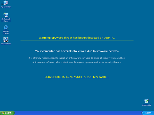 AntispyStorm, a clone of DioCleaner, is a rogue anti-spyware program that uses deceptive tactics to trick you into buying their full version of the program. AntispyStorm attempts to scare you into purchasing their software by displaying fake Warning messages that your PC is infected. AntispyStorm is downloaded by Trojans through browser security holes.