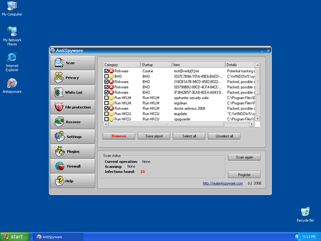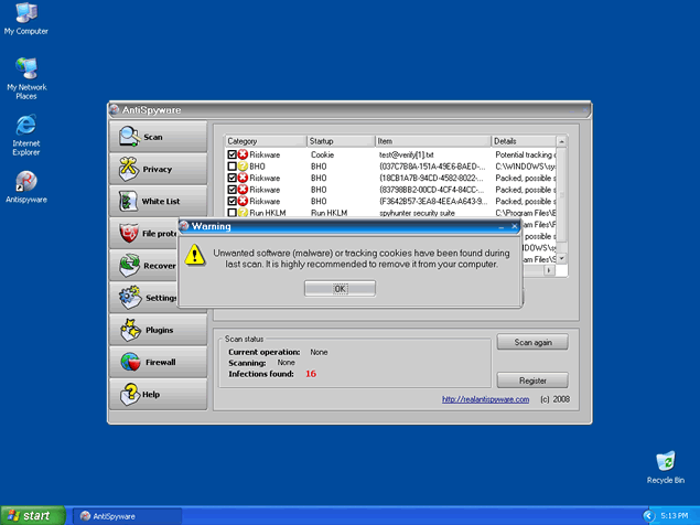 Antispyware or 2-Antispyware is a fake anti-spyware program that is often downloaded and installed without user knowledge or consent by a Trojan or through browser security holes. Antispyware launches on Windows startup and may generate large numbers of popup adverts. Antispyware will also display notifications of imaginary security risks in its attempts to get the user to purchase the full version. Antispyware program can be extremely difficult to remove manually, and will continue to try to recreate itself. Antispyware parasite is affiliated with the website 2-antispyware.com.