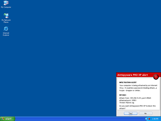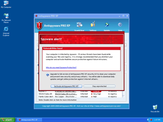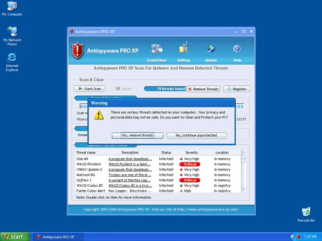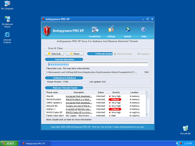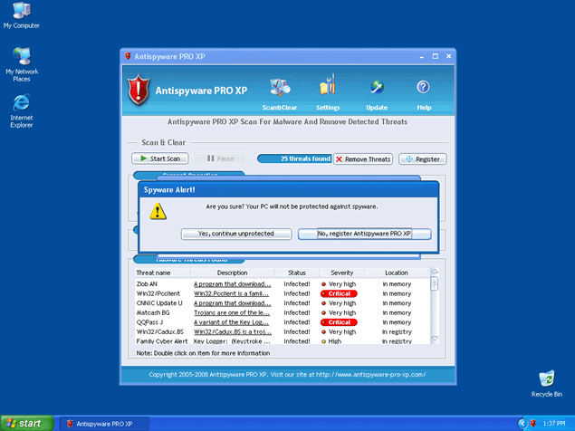 If you click on the fraudulent error message, a free trial version of AntiSpyware Pro XP may install on your computer. After AntiSpyware Pro XP runs a scan of your computer, it will then offer you to remove the parasites it "found" when you purchase the full version of the AntiSpyware Pro XP program. It is strongly recommended to remove AntiSpyware Pro XP from your system without any hesitation. AntiSpyware Pro XP is a clone of Antivirus 2008, Windows Antivirus 2008, XP Antivirus 2008 and Vista Antivirus 2008.