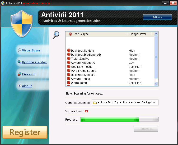 However, as is true of other types of rogue anti-virus applications, SpywareRemove.com malware analysts note that Antivirii 2011's primary trait is its ability to pretend to scan your PC and return results that lack any basis in reality. Antivirii 2011 may tell you that Antivirii 2011 is scanning your PC or even that it's found backdoor Trojans, worms or adware, but Antivirii 2011 is incapable of detecting or deleting real PC threats of any kind. These fake AV simulations have no point beyond being an excuse for Antivirii 2011 to request your credit card information in a purchase form, which is, obviously, not a safe course of action for your computer.