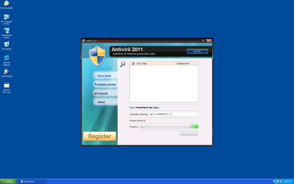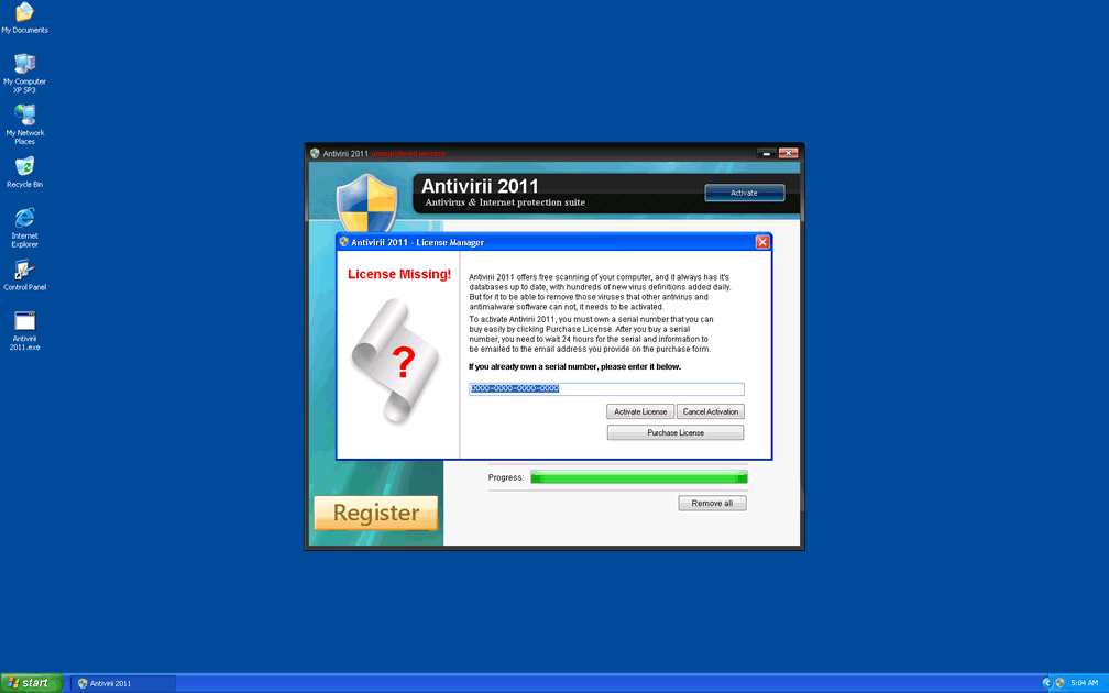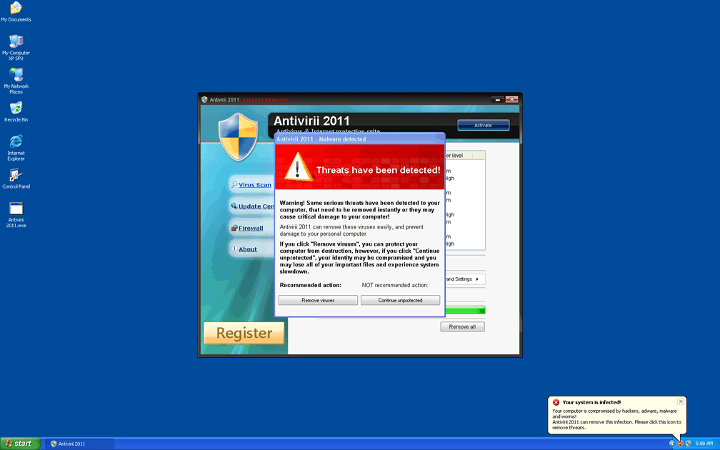 Although Antivirii 2011 and other types of NRB scamware haven't been noted to have any other capabilities, PC threats (such as Trojan droppers) that are commonly-installed alongside Antivirii 2011 and other types of rogue anti-virus programs may engage in other attacks. Some issues that you may struggle with prior to removing Antivirii 2011 can include: