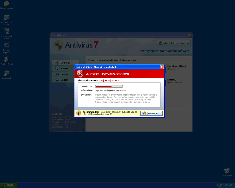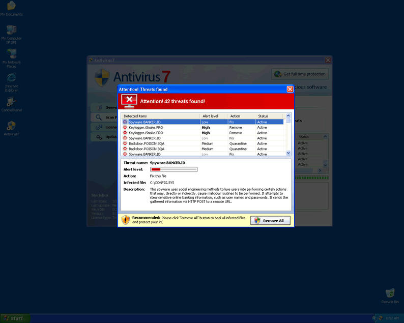Antivirus 7 is a rogue anti-virus program that reports false threats and displays fake security alerts on your PC. Antivirus 7 does this to convince you that your computer is infected with malware. This fake program is promoted and installed through the use of Trojans and often comes bundled with other malicious software. Antivirus 7 is part of a blatant scam used to con you into paying for removal of infections which don't exist. Remove Antivirus 7 and all associated threats using an updated anti-virus program.