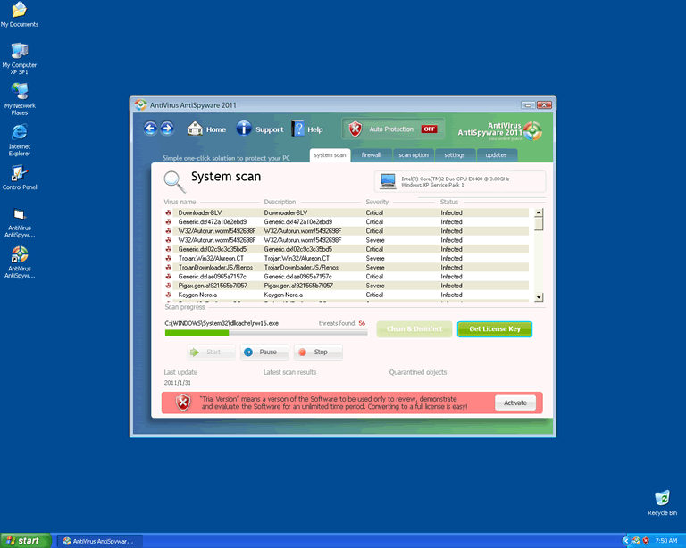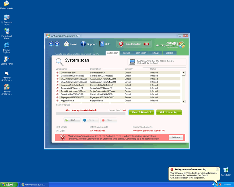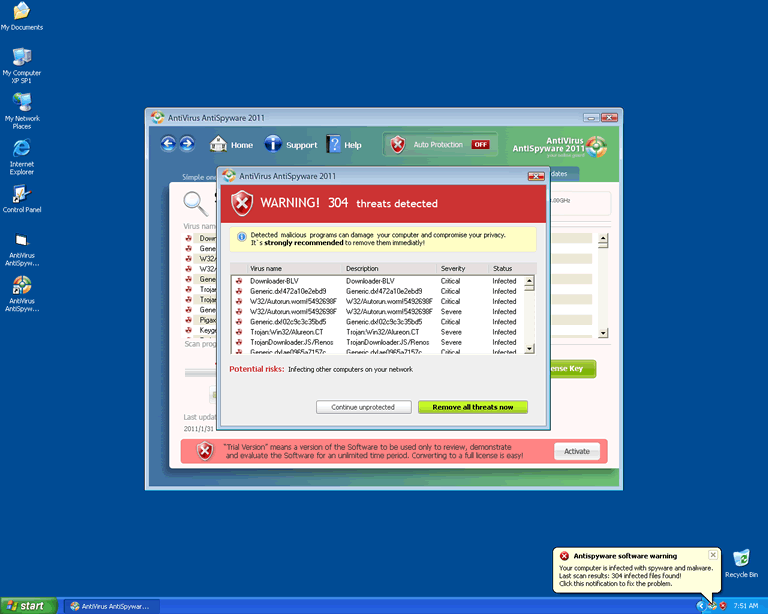 Rogue security programs like AntiVirus Antispyware 2011 are primarily distributed through Trojans that trick users into installing the program themselves. After being installed, AntiVirus Antispyware 2011 and other invaders like AntiVirus Antispyware 2011 will turn your computer-using experience into a hellish ride filled with terrifying warning and alert pop-ups. Some prominent message possibilities include: