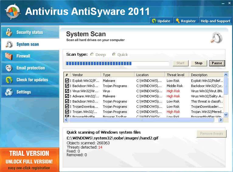 You may also acquire AntiVirus AntiSyware 2011 by being a victim of a Trojan download. Most Trojans that drop rogue anti-spyware application payloads will imitate Windows error messages or warn you about Trojans that require mysterious downloads to remove. Turning to verified anti-malware software to detect and remove all infections will prevent you from getting sucker-punched by AntiVirus AntiSyware 2011.