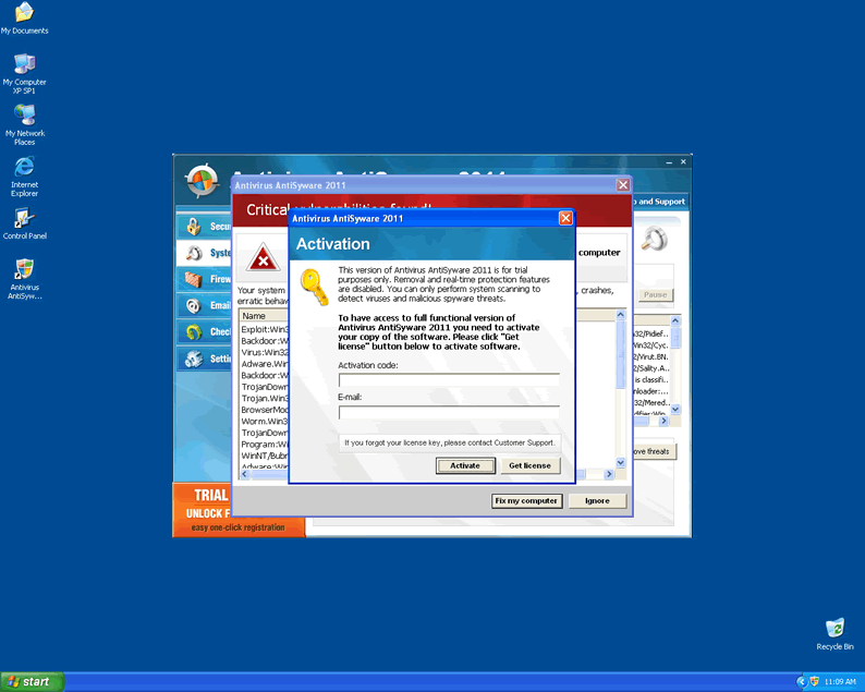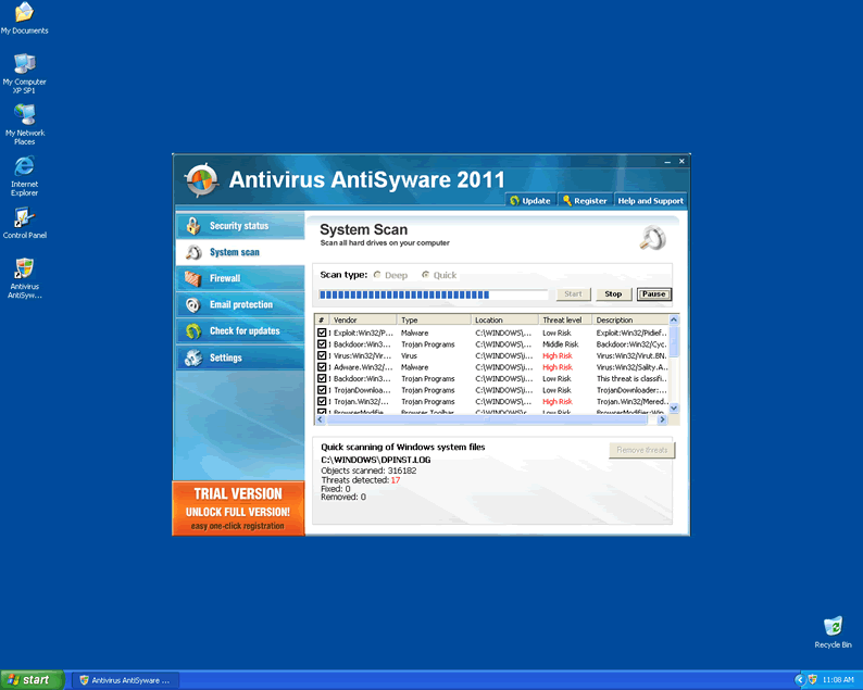 In addition to these fake alerts, AntiVirus AntiSyware 2011 will show scans absolutely crammed full of nonexistent viruses and other infections. AntiVirus AntiSyware 2011 may also hijack your web browser to control the websites it visits or shut down security programs.