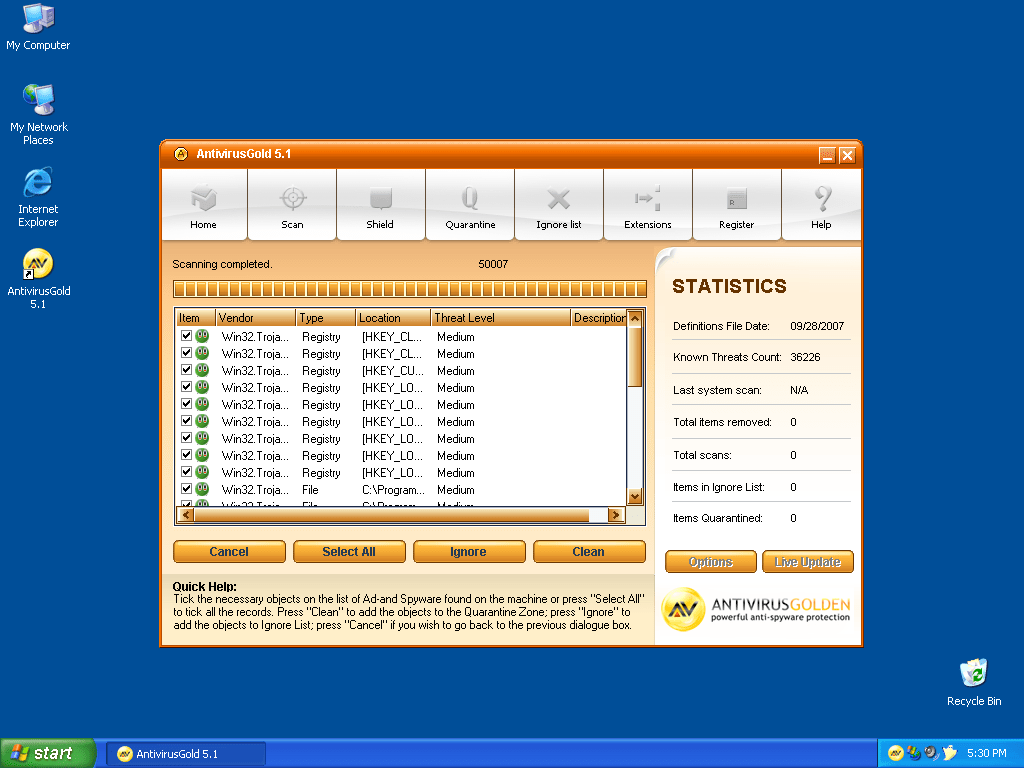 AntivirusGold is a rogue anti-spyware application that pops up a fake notification to make you believe that your computer is infected with spyware. This message may seem similar to the one issued from Windows Security Center. AntivirusGold may be installed to your computer with the help of Trojans or through various security exploits. Although the makers of AntivirusGold seek to goad you into purchasing AntivirusGold, this program should not be trusted. It is reported that AntivirusGold is associated with Antivirus Golden, SpyHeal, SpywareQuake.
