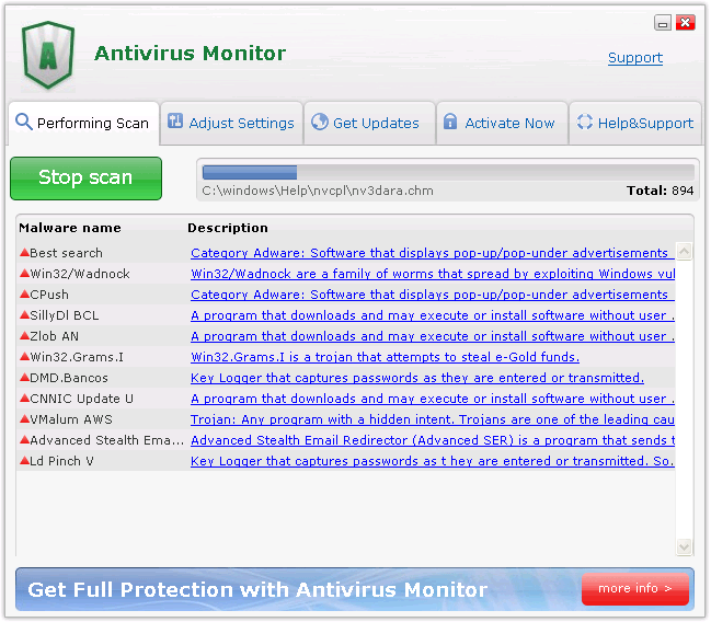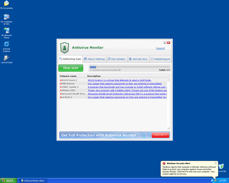 A look through Antivirus Monitor's history will only leave a bad taste in your mouth; Antivirus Monitor is linked to such unsavory rogue programs as Spyware Protect 2009, Antivirus System Pro, Security Central, Antivirus Soft, Antivirus Suite, AntiSpyware Soft, Antivir Solution Pro, Security Suite, Malware Destructor 2011, Antivirus Action, Antivirus Scan, PC Security 2011, Antivirus .NET, AntiVira Av, AntiMalware GO, Antivirii 2011 and AnVir Security Suite. Antivirus Monitor, like its relatives, configures your registry to let the rogue product run whenever Windows loads. This is usually followed by Antivirus Monitor showing up before your desktop and strongly encouraging a system scan before you can resume using your computer.