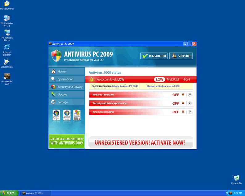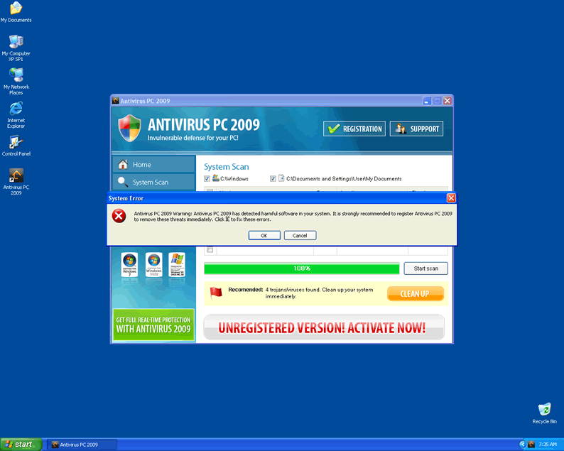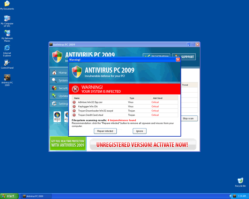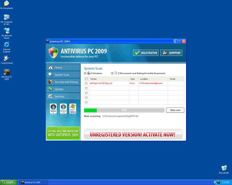 Once installed, Antivirus PC 2009 will reboot the system and then run a system scan. The results of the scan are typically fake and will be used to scare PC users to visit a corrupt website promoting Antivirus PC 2009. Antivirus PC 2009 will also flood the infected computer with annoying pop-ups and notifications stating the importance of purchasing a licence. These actions are all part of devious plan to steal money and privacy. Do not be fooled by Antivirus PC 2009's trickery and have the parasite removed immediately.