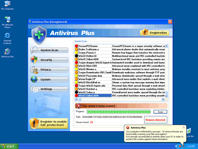Once Antivirus + is installed, it will issue fake popups and system notification messages stating that your computer system is flooded with spyware. In order to remove these imaginary threats, Antivirus Plus will offer its "licensed" version. All links provided by Antivirus Plus will most likely redirect you to Antivirus Plus's website (antivirus-plus.org) or other corrupt websites that distribute Antivirus Plus as a legitimate software. Moreover, Antivirus Plus is able to emulate a computer system scan and display a list of spyware infections as a result. In addition, Antivirus Plus may download additional malware and may launch on every Windows startup.