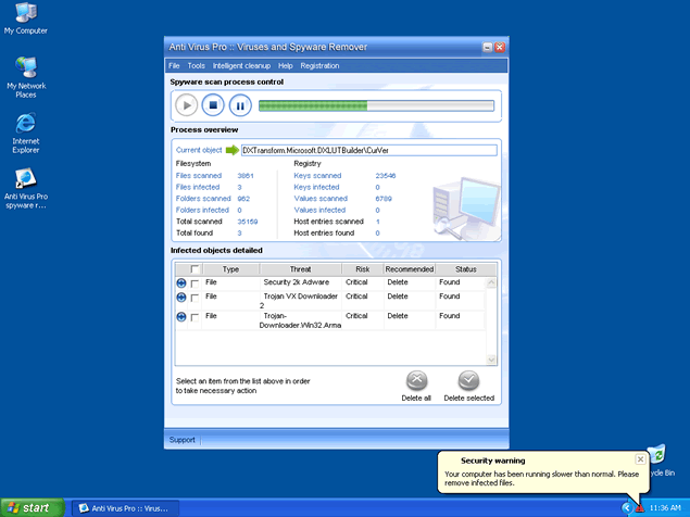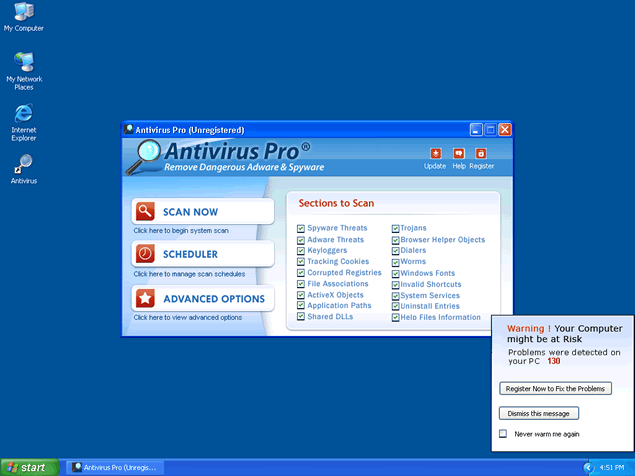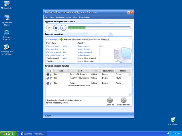 AntiVirus Pro is a corrupt anti-spyware application. Once purposively installed, AntiVirus Pro will show fake warnings claiming that your computer is infected with spyware threats. The makers of AntiVirus Pro seek to swindle you out your money and good to pay for their rogue program called AntiVirusPro. Additionally, AntiVirus Pro has an ability to change your Windows desktop wallpaper. AntiVirus Pro is affiliated with 1stAntivirus.