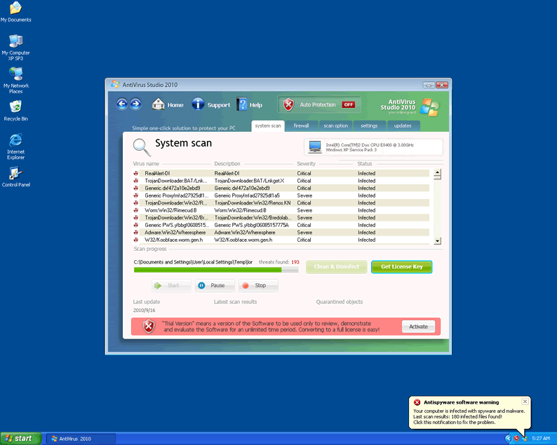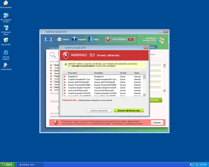 Antivirus Studio 2010 (or AntivirusStudio2010) is a rogue antivirus program designed to pilfer money from unwary computer users. Antivirus Studio 2010 employs a browser hijacker to redirect users to a fake scan page which produces bogus results claiming the PC is infected with malware. The system will then be bombarded by pop-up alerts urging the purchase of AntivirusStudio2010. Do not fall for this trickery. Remove Antivirus Studio 2010 using a reliable malware remover.