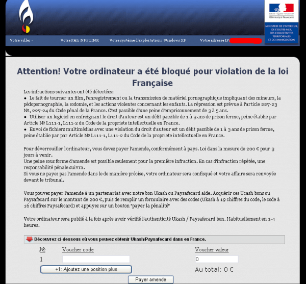 'Attention! Votre ordinateur a ete pour violation' ransomware has a fairly strong resemblance to other ransomware Trojans from the 'Ukash Virus' family – such as Sacem Police Nationale Ransomware, Office Central de Lutte contre la Criminalité Ransomware or the Strathclyde Police Ukash Virus. Anti-malware programs will often identify these Trojans by names such as Trojan:Win32/Ransom.DU or Trojan:Win32/Ransom.FL. Although 'Attention! Votre ordinateur a ete pour violation' ransomware uses a slightly different template from the norm, this is in keeping with recent variants of these Trojans, which have been identified in numerous variants for countries on both sides of the Atlantic, particularly France and other European countries.