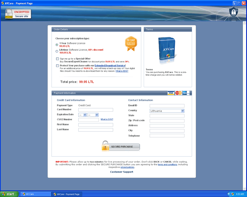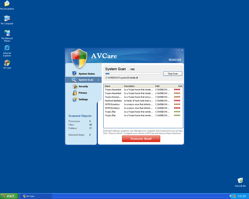 AV Care is a fake spyware remover typically sponsored by rogue websites. Once installed onto your computer, it initiates a fake system scan that reports fabricated infection results. You are then prompted to download AV Care in order to combat these nonexistent threats. AV Care then begins running as soon as your Windows starts up, and bombards you with pop-up windows and fraudulent security alerts, scaring you into purchasing and downloading the full version of AV Care.
