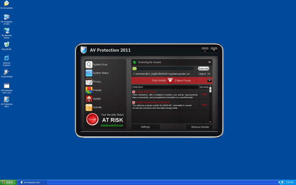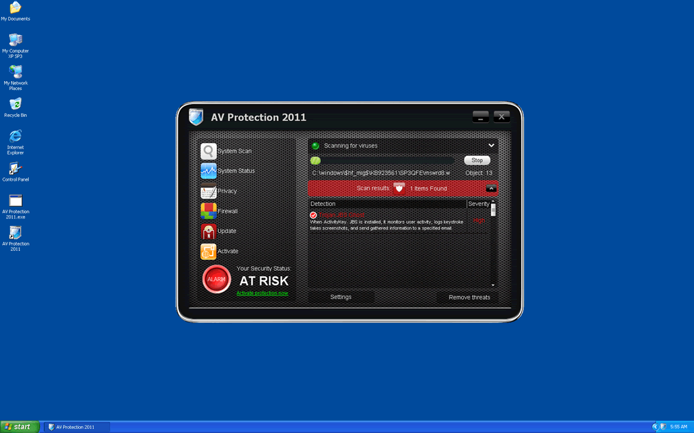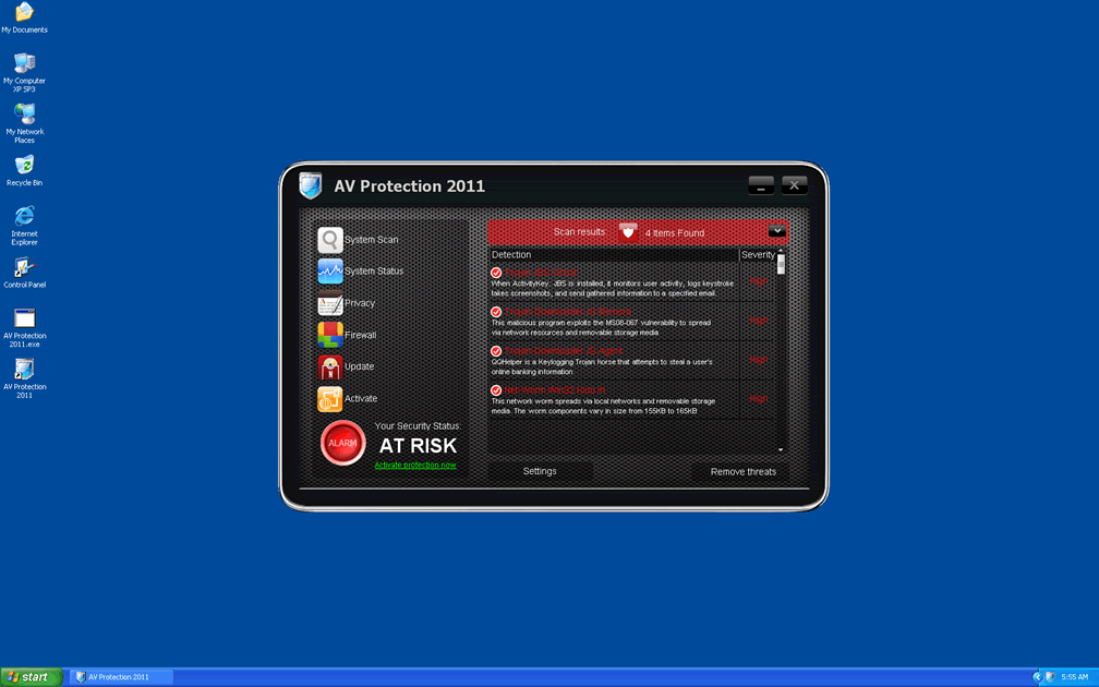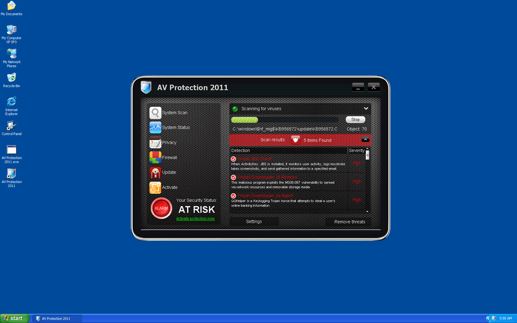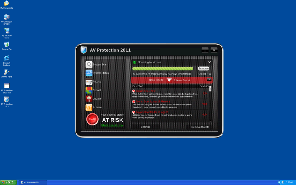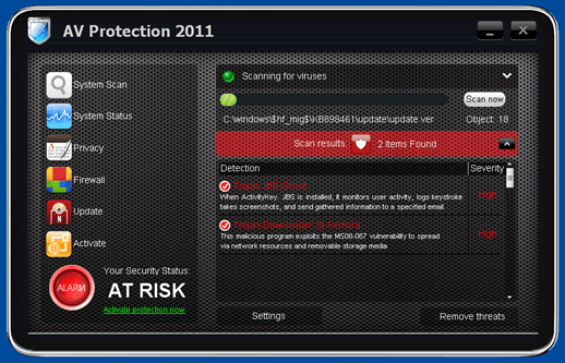 Although AV Protection 2011 acts like a powerful and unique security program on the outside, AV Protection 2011's appearance, functions and even its marketing schemes are all copied from other forms of rogue security applications belonging to the FakeScanti such as {template:related_rogues] AV Protection 2011 utilizes a traditional PC security scam by pretending to detect various forms of PC threats on your PC and then presenting itself to remove them... for a price. However, all of AV Protection 2011's alerts are, in reality, fake, and SpywareRemove.com malware researchers have found that AV Protection 2011 is incapable of removing any type of real infection, including Trojans, keyloggers and worms.
