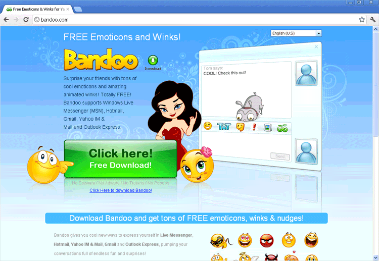 Bandoo.com claims that its add-on will enhance your instant messaging experience by giving you additional emoticons (smiley faces), and, to an extent, this is true. What Bandoo.com doesn't bother to mention is that only other users of Bandoo.com software can see these smileys in the first place, in addition to other significant drawbacks that come along with Bandoo.com's emoticon package: