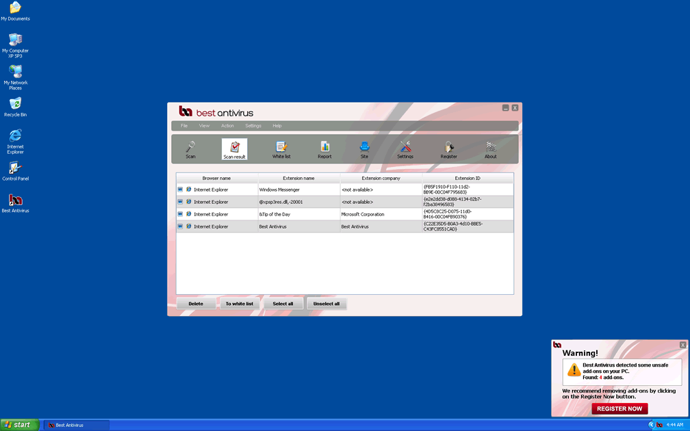 - Pop-ups that request that you register Best Antivirus or another type of scamware product to remove any PC threats that Best Antivirus supposedly detects. Ignore these sales pitches, since buying Best Antivirus is unnecessary to deactivate and remove Best Antivirus from your PC and has no point except to give money and financial information to criminals.