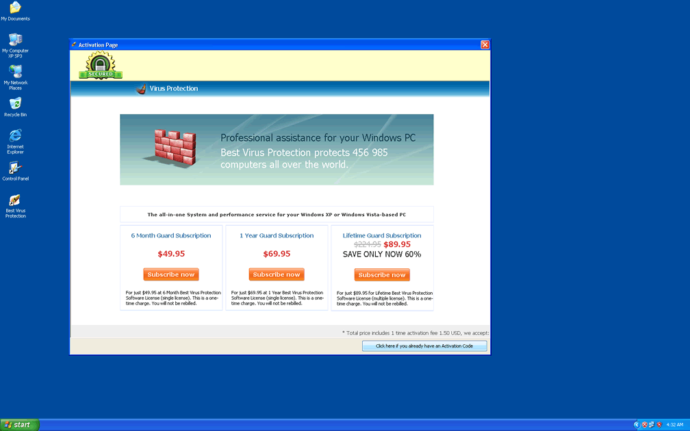 Best Virus Protection is a member of a growing subgroup of fake anti-malware applications from the FakeVimes family that reuse both their looks and the majority of their code between individual members. Best Virus Protection's clones number among them Privacy Guard Pro, Extra Antivirus, Fast Antivirus 2009, Presto TuneUp, Windows Security Suite, Smart Virus Eliminator, Packed.Generic.245, Volcano Security Suite, Windows Enterprise Suite, Enterprise Suite, Additional Guard, Live PC Care, PC Live Guard, Live Enterprise Suite, Security Antivirus, My Security Wall, CleanUp Antivirus, Smart Security and PrivacyGuard Pro 2.0. SpywareRemove.com malware researchers state with authority that the only significant difference between these rogue anti-malware products lies in their names and from any single one of them, including Best Virus Protection, the 'best' that you can expect to experience is a set of fraudulent security features.