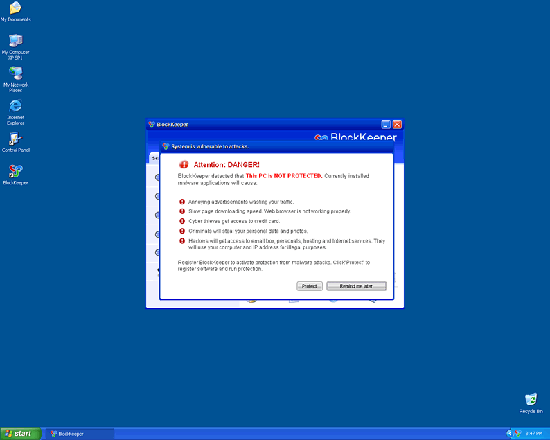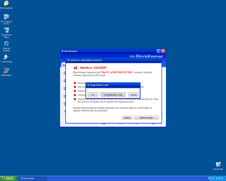 BlockKeeper is a new rogue anti-spyware from the WiniGuard group of malicious rogues. This parasite is another clone of the BlockScanner and BlockWatcher family of rogue anti-spyware programs. BlockKeeper is no different than any of it's predecessors as it uses downloader trojans and drive-by downloads to infiltrate the system and flood the user with popups and false system notifications. These pop-ups falsely inform the user of an infection or multiple infections present on the system. Like other rogues, BlockKeeper backs up these fake claims with system scans which mark harmless files as threats and urges the user to download their licensed version. BlockKeeper is a serous security threat and should be removed immediately when detected.