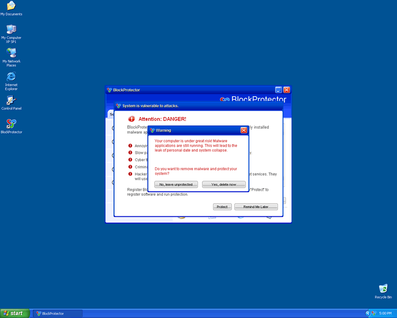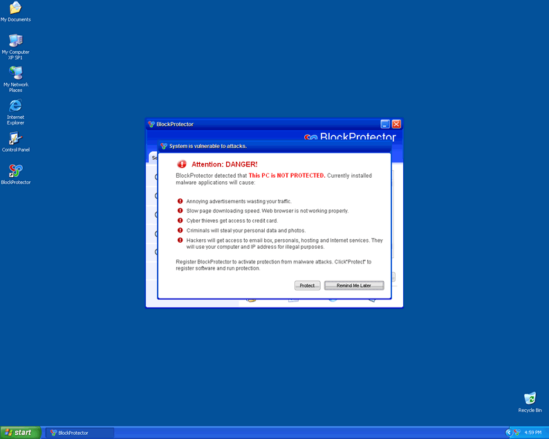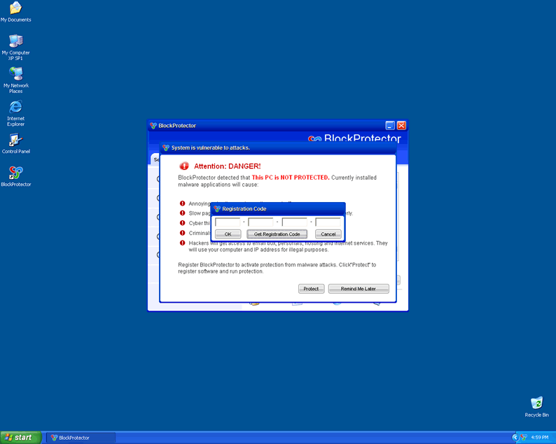 BlockProtector is a fake anti-spyware application from the WiniGuard family of rogues that use devious trojans to do their dirty work on an infected system. The malicious parasite creates additional files on the registry that are detected as threats on PC scans. BlockProtector is configured to start as the infected computer is turned on and will run a scan on the machine to find a list of viruses. BlockProtector will attempt to scare the user by displaying warnings and alerts on the screen. If detected, it is recommended that you take extreme caution and remove BlockProtector immediately.