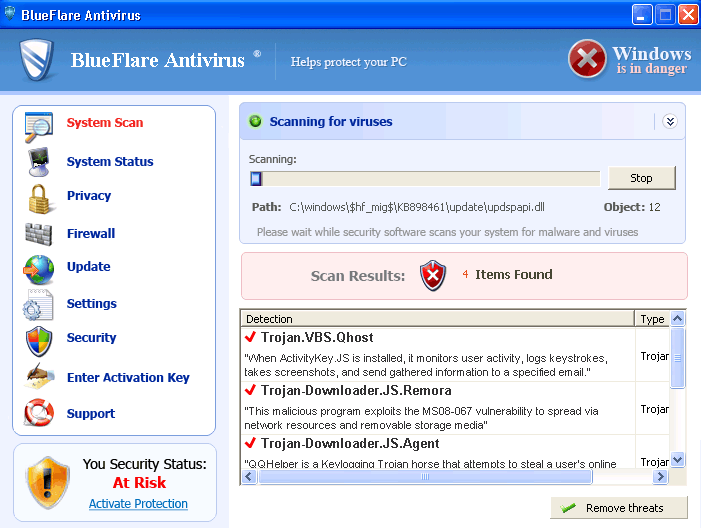 If you do become infected with BlueFlare Antivirus, you'll notice that BlueFlare Antivirus immediately finds a large amount of problems lurking under the veneer of your computer's seemingly good health. However, all alerts, pop-up warnings and scanner results that are created by BlueFlare Antivirus provide inaccurate information that alerts you to infections and other system problems that don't, in reality, exist at all. Deleting BlueFlare Antivirus is crucial, but since BlueFlare Antivirus alters the Registry and can infect System Restore, you should avoid manual removal methods in lieu of using good security software.