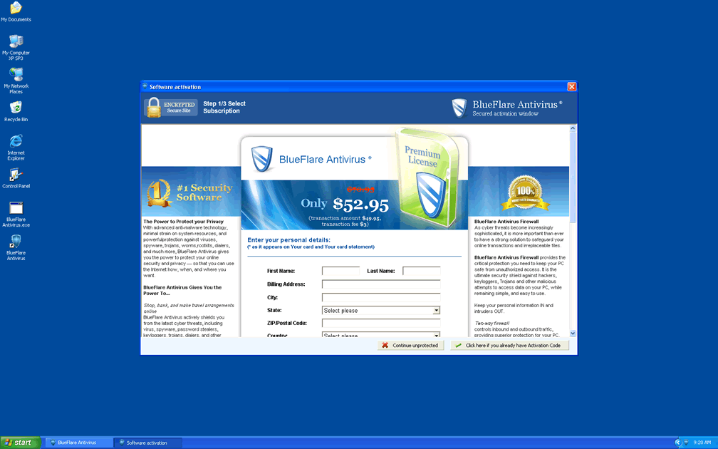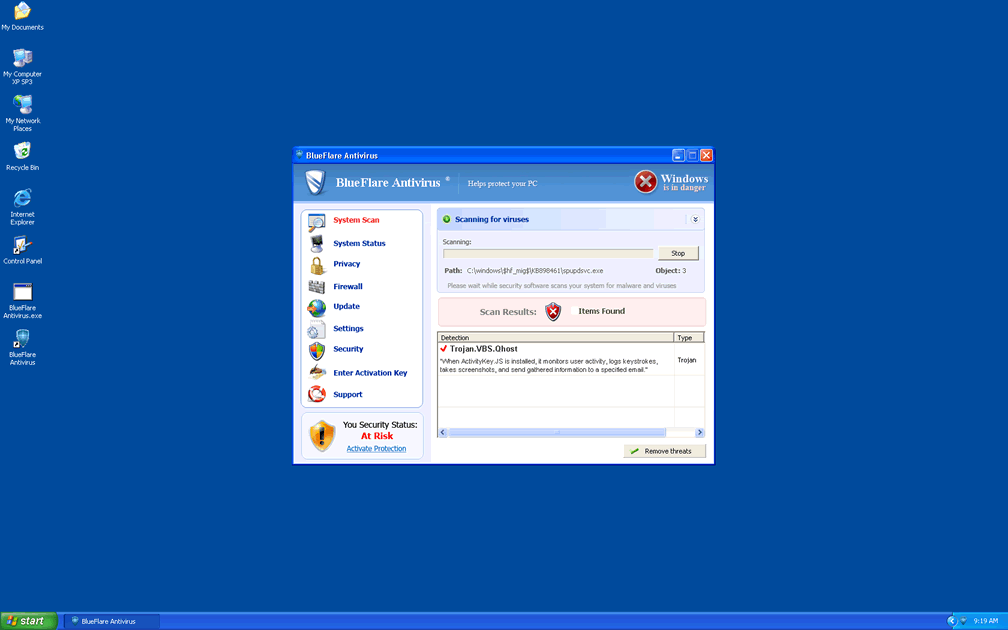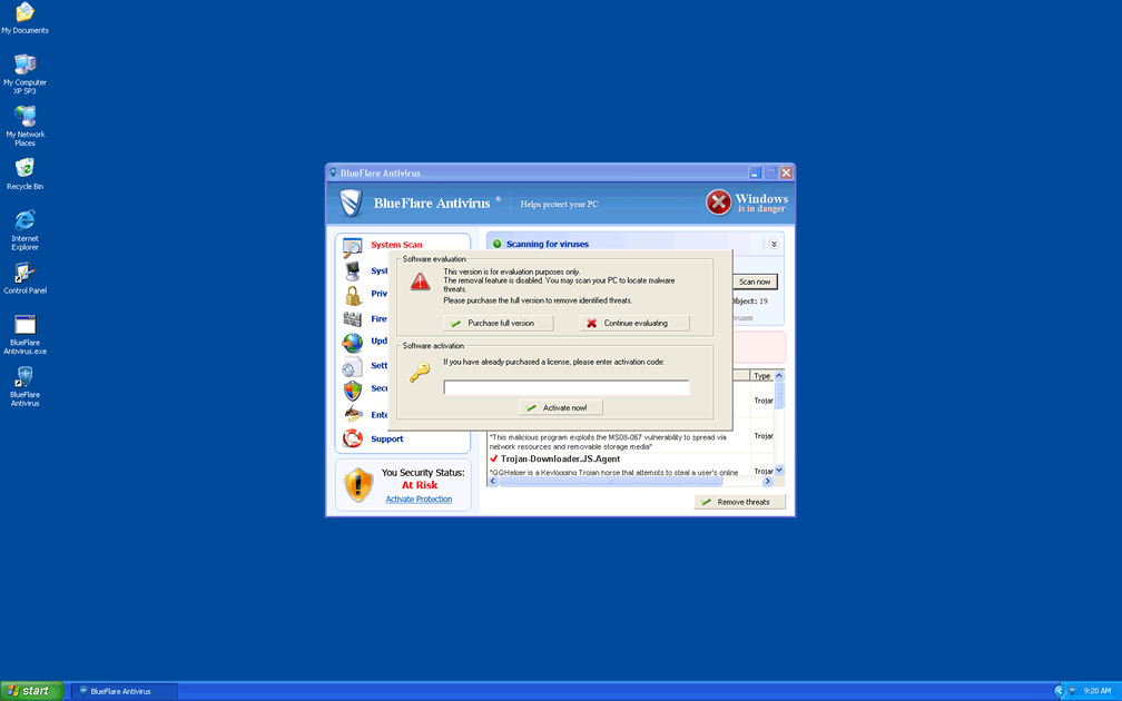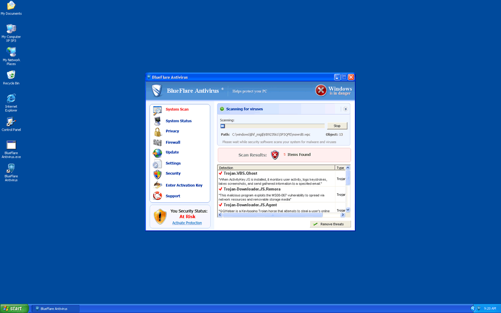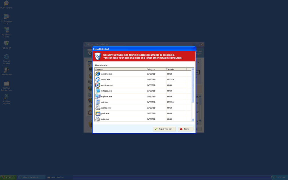 If you take a look beyond BlueFlare Antivirus's fake anti-virus appearance, you can see that BlueFlare Antivirus is the cause of even more serious problems than mere fake error messages. Standard issues that accompany BlueFlare Antivirus infections include, but aren't restricted to: