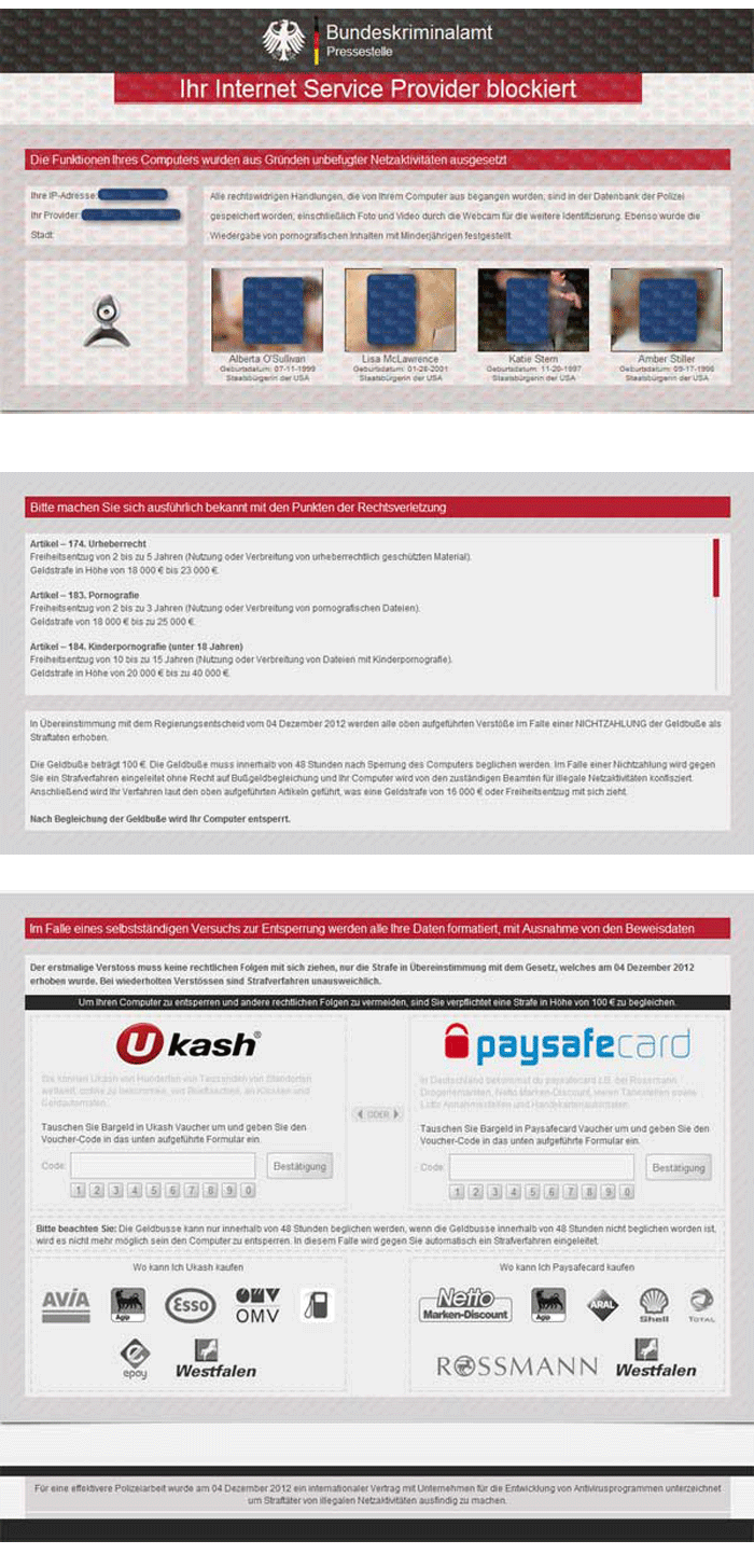 | 1 | Bundeskriminalamt Pressestelle Ihr Internet Service Provider ist blockiert Die funktionen Ihres Computers wurden wegen unbefugter Netzaktivitäten geblockt […] Bitte machen Sie sich ausführlich bekannt mit den Punkten der Rechtsverletzung Artikel— 183. Pornografie […] Artikel— 184. Kinderpornografie (unter 18 Jahren) |