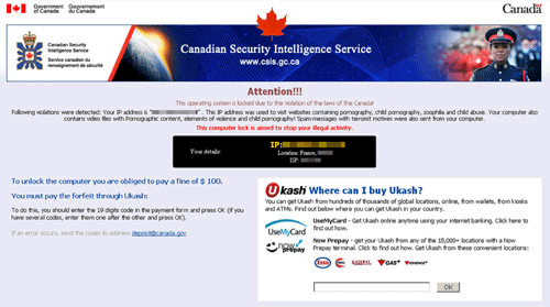 | 1 | Government of Canada Gouvernement du Canada Canadian Security Intelligence Service Service canadien du renseignement de sécurité www.csis.gc.ca Attention!!! This operating system is locked due to the violation of the laws of the Canada! Following violations were detected: Your IP address is [removed]. This IP address was used to visit websites containing pornography, child pornography, zoophilia and child abuse. Your computer also contains video files with pornographic content, elements of violence and child pornography! Spam-messages with terrorist motives were also sent from your computer. This computer lock is aimed to stop your illegal activity. To unlock the computer you are obliged to pay a fine of $ 100. You must pay the forfeit through Ukash: To do this, you should enter the 19 digits code in the payment form and press OK (if you have several codes, enter them one after the other and press OK). If an error occurs, send the codes to address deposit@canada.gov |