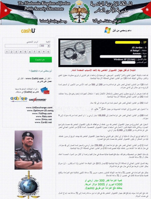 The CashU Virus is the Middle Eastern branch of a family of Police Ransomware Trojans that have terrorized every continent of the globe, with an especial emphasis on Europe and various first-world countries. Other than being distinguished by its ransom payment preference of CashU (as opposed to Ukash, Paysafecard and other methods preferred by different branches of this family), the CashU Virus is identical to past examples of similar PC threats and attempts to lock your computer with a fake legal excuse about your supposedly criminal online activities. The CashU Virus designs its pop-ups to be specific to the country of the PC the CashU Virus attacks, but SpywareRemove.com malware researchers never have found a case of a CashU Virus enacting its attacks with any accuracy or any legitimate legal authority. When confronted with a CashU Virus's pop-up, deleting the CashU Virus without paying its ransom always should be your foremost goal, but anti-malware tools may be required to be certain of removing a CashU Virus entirely.