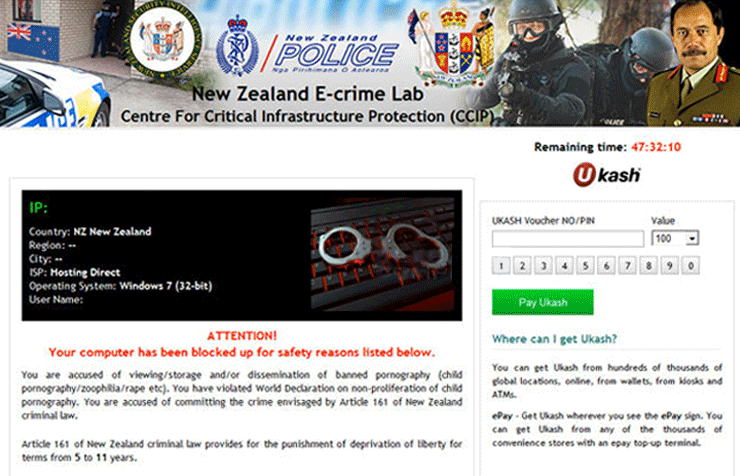 | 1 | New Zealand E-Crime Lab New Zealand Police Centre for Infrastructure Protection (CCIP) Interpol Attention! Your computer has been blocked for safety reasons listed below. You are accused of viewing/storage and/or dissemination of banned pornography (child pornography/zoophilia/rape etc). You have violated World Declaration on non-proliferation of child pornography. You are accused of committing the crime envisaged by Article 161 of New Zealand criminal law. Article 161 of New Zealand criminal law provides for the punishment of deprivation of liberty for terms from 5 to 11 years. Also, you are suspected of violation of "Copyright and Related rights Law" (downloading of pirated music, video, warez) and of use use and/or dissemination of copyrighted content. Thus, you are suspected of violation of Article 148 of New Zealand Criminal Law. Article 148 of New Zealand criminal law provides for the punishment of deprivation of liberty for terms from 3 to 7 years or 150 to 550 basic amounts fine. It was from your computer, that unauthorized access had been stolen to information of State importance and to data closed for public Internet access. . <more fake legal threats> . The penalty set must be paid in course of 48 hours as of the breach. On expiration of the term, 48 hours that follow will be used for automatic collection of data on yourself and your misconduct, and criminal case will be opened against you. Amount of fine is NZD $100. You can pay a fine Ukash vouchers. As soon as the money arrives to the Treasury account, your computer will be unblocked in course of 24 hours. Then in 7 day term you should remedy the breaches associated with your computer. Otherwise your computer will be blocked up again and criminal case will be opened against yourself (with no option to pay fine). |
