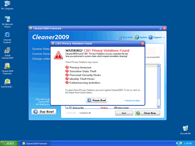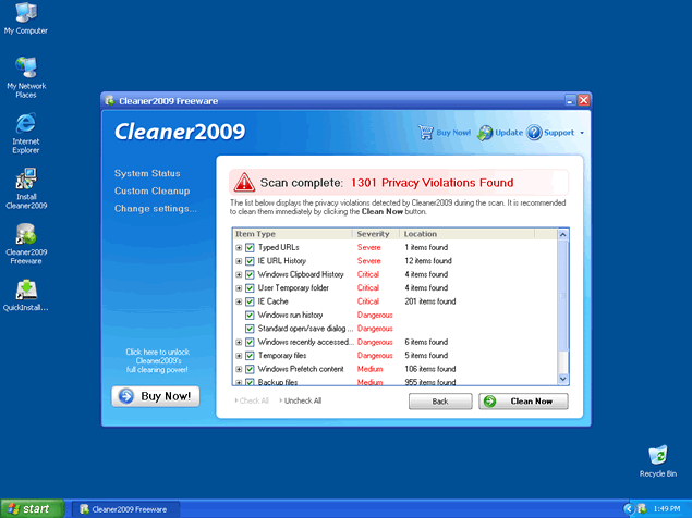 Cleaner 2009 prompts users with multiple warning messages and popups that state Cleaner 2009 detected spyware on the machine. This is a poor attempt by Cleaner 2009 to get you to purchase the Cleaner 2009 program. Cleaner 2009 program may be difficult to remove manually. Popular rogue anti-spyware programs like Cleaner 2009 are reskinned and renamed to confuse unsuspecting computer users.