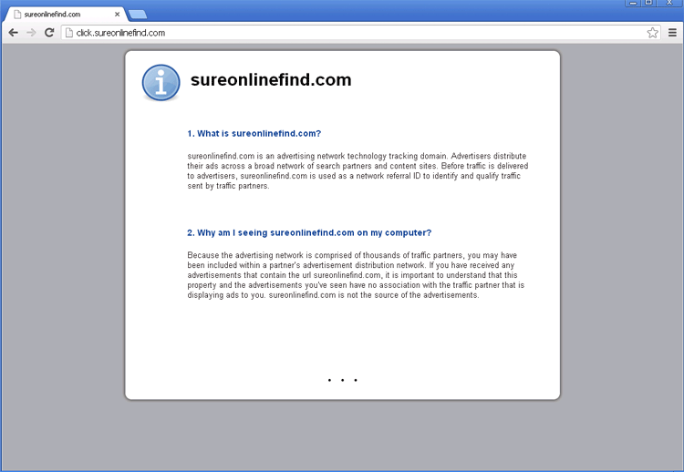 Click.sureonlinefind.com is an advertising network-tracking domain that sometimes is linked to browser-hijacking attacks that force Click.sureonlinefind.com's advertisements to display on your browser. These browser hijackers aren't linked to Click.sureonlinefind.com directly, and Click.sureonlinefind.com hasn't been linked to malicious content in a direct fashion, but SpywareRemove.com malware experts do caution that advertisements displayed through Click.sureonlinefind.com may be harmful to your computer. Browser redirects to Click.sureonlinefind.com and similar browser-related problems always should be considered minor security issues, and a solid anti-malware product should be used for removing any PC threats affiliated with Click.sureonlinefind.com-based browser problems.