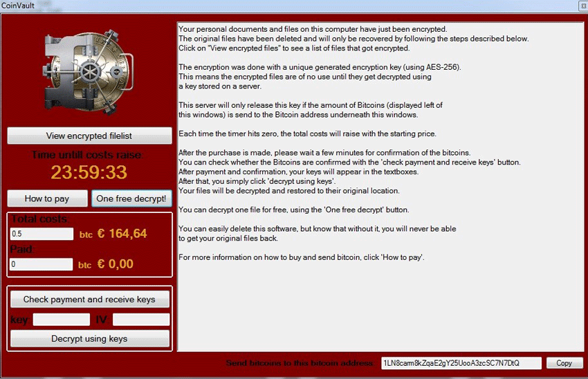 CoinVault is detected as encryption threat, also known as ransomware. When the system is infected with ransomware, your files are encrypted, and users need to pay a 'ransom' if they want to regain control of their computer. CoinVault ransomware is quite similar to the CryptoWall 2.0 ransomware, still CoinVault is the less sophisticated variant. Once you have CoinVault on your computer, most of your files will be encrypted. There is an option for a one-time free decryption, but in the end, you have no choice but to pay the ransom. Once infected with CoinVault, users are forced to pay 0.7 Bitcoin ransom or their system remains locked; additionally, there is a timer that causes the cost to get higher, which is also quite disturbing. In order to prevent your system from ransomware such as CoinVault, computer threat specialists advise users to be extremely cautious for spam emails with corrupted attachments.