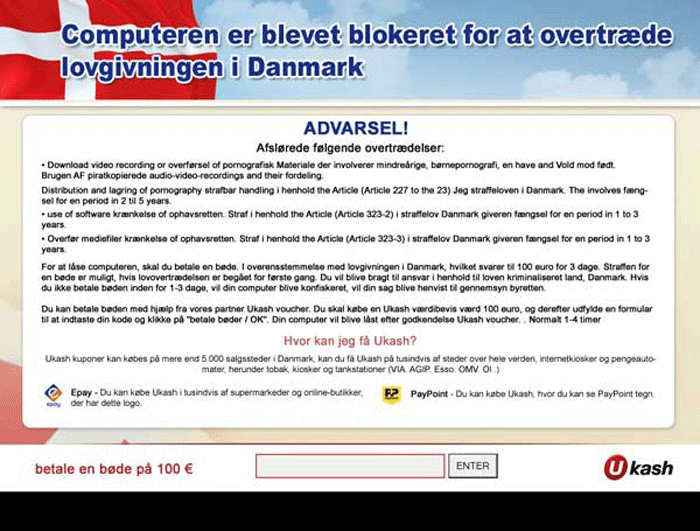 As a Denmark-specific ransomware Trojan, 'Computeren er Blevet Blokeret' Ransomware displays fraudulent legal alerts that claim to have detected child pornography and other illegal media associated with your computer. Even though 'Computeren er Blevet Blokeret' Ransomware cites various legal references, SpywareRemove.com malware analysts note that 'Computeren er Blevet Blokeret' Ransomware isn't capable of detecting crimes and isn't affiliated with the law enforcement of Denmark (or any other country). Like many of its relatives, 'Computeren er Blevet Blokeret' Ransomware asks you to pay a fine through Ukash to unlock your PC from this fake warning message and associated problems, but SpywareRemove.com malware researchers consider it wiser simply to disable and then remove 'Computeren er Blevet Blokeret' Ransomware with a combination of anti-malware software and standard PC security techniques.