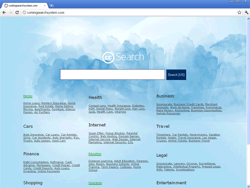 Corkingsearchsystem.com is a member of a large scam that uses a small army of websites to infect innocent visitors, forces them towards affiliate websites and then profits off of the resultant traffic. Other website cohorts in this scam, which can be recognized by their usage of the white CC Search logo, include coolsearchsystem.com, uncommonsearchsystem.com, marveloussearchsystem.com, noblesearchsystem.com, Unusualsearchsystem.com, raresearchsystem.com, neatsearchsystem.com, wickedsearchsystem.com, Swellsearchsystem.com and strikingsearchsystem.com. Redirects to any of these websites should be considered just as dangerous as a redirect to Corkingsearchsystem.com itself.