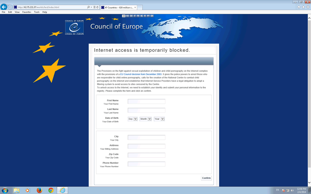 | 2 | Internet access is temporarily blocked. To verify your identity we need more information. Please enter your credit card information, we will deduct from your credit card 0.01 EUR and return them back within an hour. With this verification procedure, we can identify you and add your personal information to the registry, access to the Internet will be unlocked. |