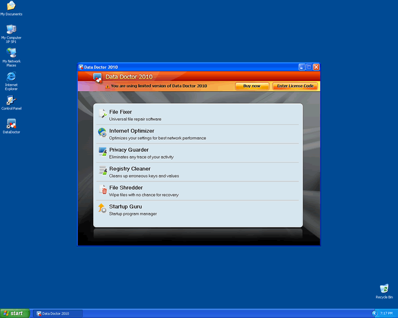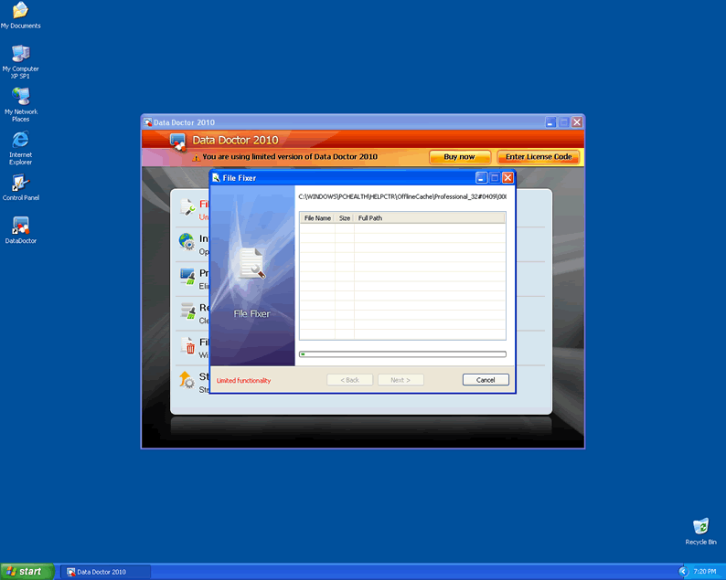 "Unrecognized disk driver command." "Windows has recovered from a serious error. Some files can be corrupted. Disk checking is strongly recommended." "Unable to open the file due to data corruption." DataDoctor 2010 spreads via corrupt websites which employ a script that installs itself on the computer. Once active, DataDoctor 2010 will make changes to system settings and registry to perform its malicious functions. Use an efficient anti-virus program to detect and remove DataDoctor 2010.