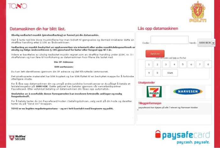 | 1 | Opphavsrettsbrudd Straffes med fengsel fra 2 til 5 år eller bot som beløper seg fra 100 000 opptil 120 000 NOK. (Bruk eller distribusjon av verk beskyttet med opphavsrett) Pornografisk produksjon hvor barn deltar (barna under 18 år) Straffes med fengsel fra 10 til 15 år eller bot som beløper seg fra 125 000 opptil 320 000 NOK. (Bruk eller distribusjon av pornografiske filer). For å låse opp datamaskinen din og unngå andre juridiske konsekvenser du må betale en bot som beløper seg til 1000 NOK. |