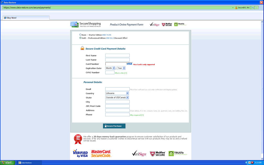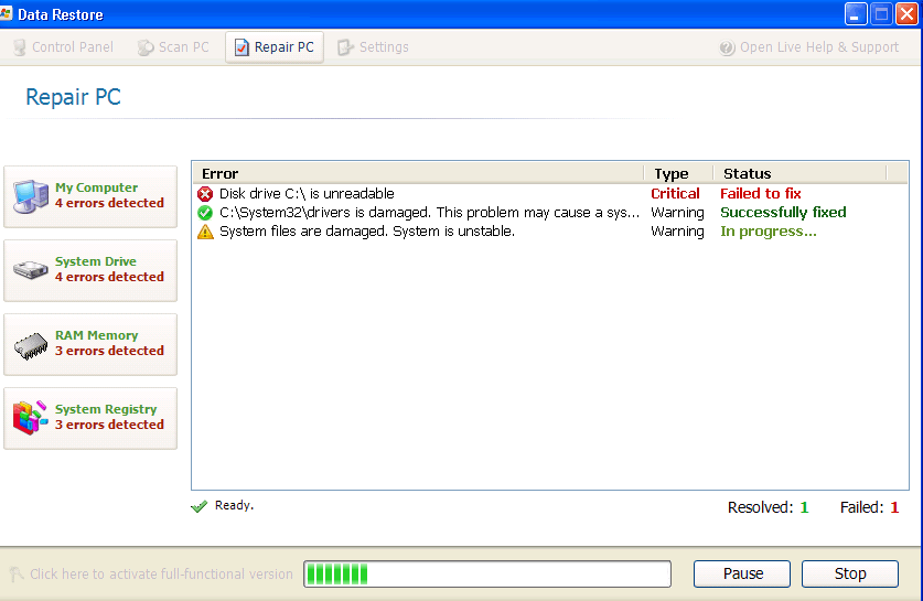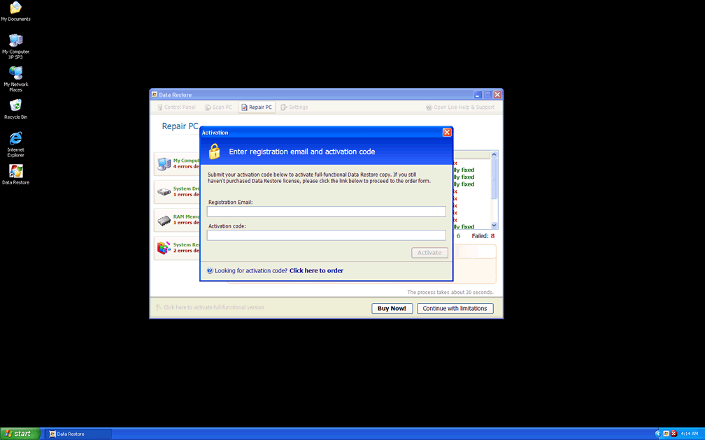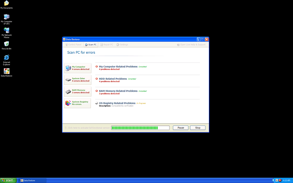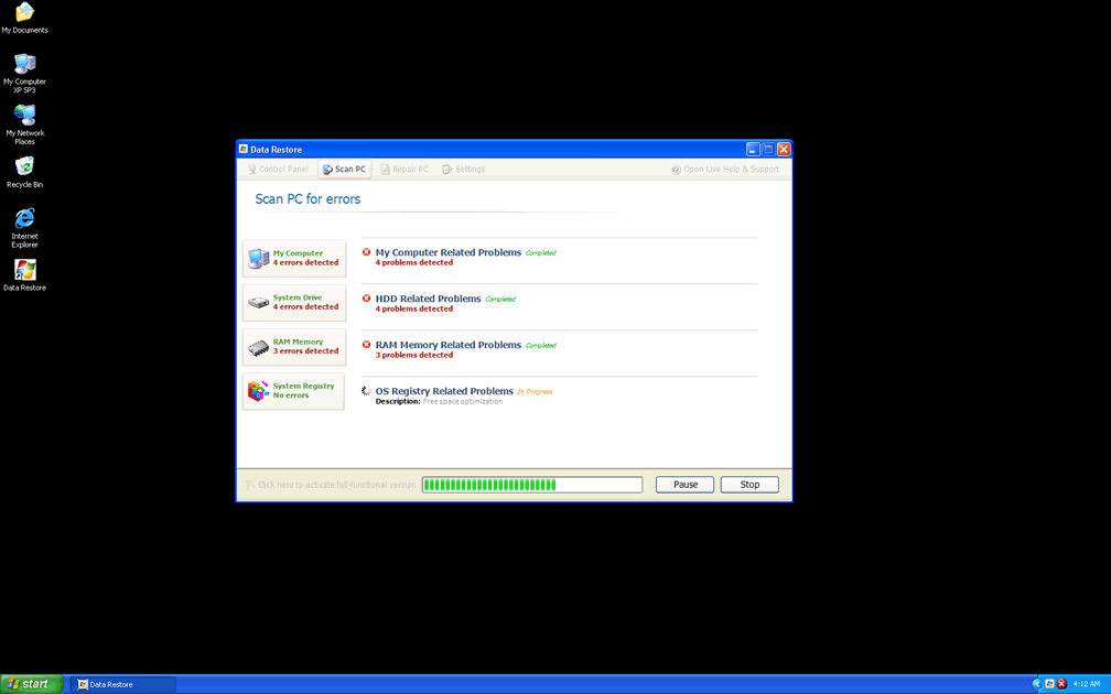 Data Restore is a rogue defragmenter, system diagnostics and information recovery tool. Our malware researchers have traced Data Restore's lineage back to the FakeScanti family wich comprises other types of fake defragmenters that share its appearance, error messages and attack methods . You should do your best to ignore the many types of fake errors that Data Restore creates on your PC; these errors aren't real system problems and have no point to their existence besides trying to make a grab at your wallet's contents. However, ignoring Data Restore isn't enough to solve a Data Restore problem, since browser hijacks, file-viewing problems and blocked applications are also common signs of a Data Restore attack. Anti-malware software is the preferred tool for deleting Data Restore, although updates and usage of Safe Mode where applicable are also important to insure that Data Restore is completely removed.