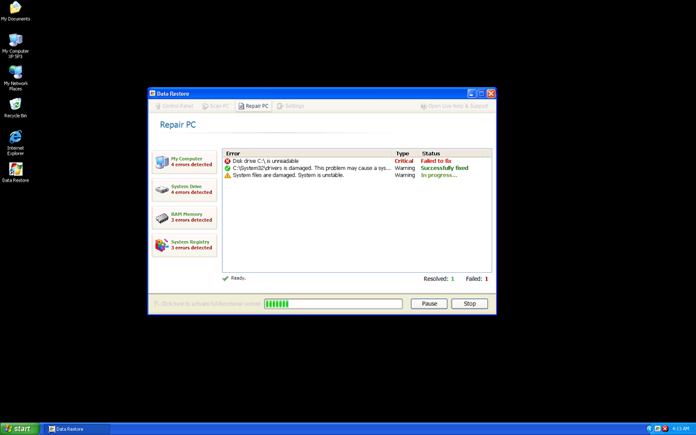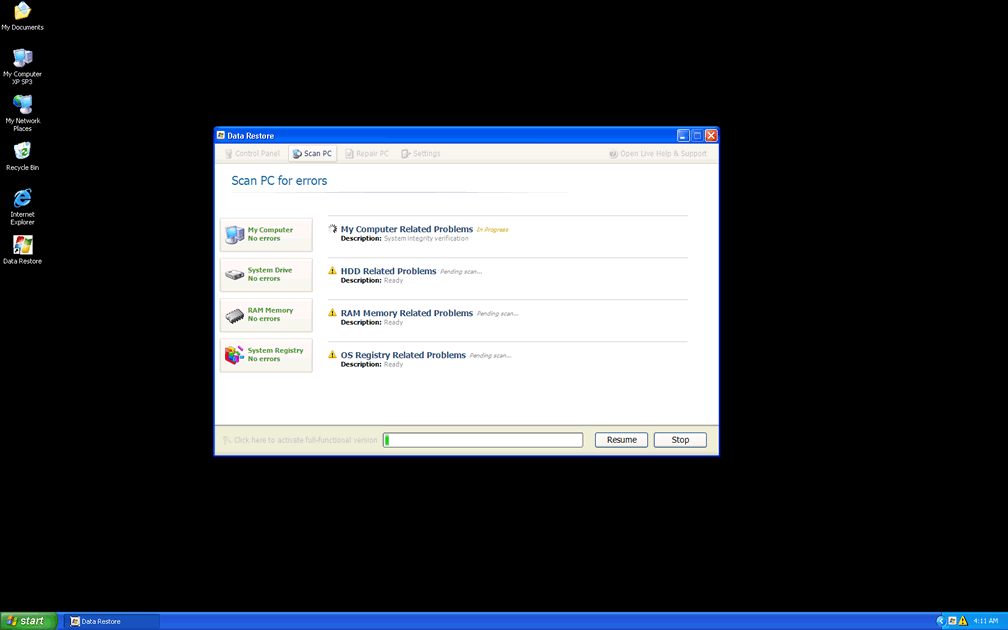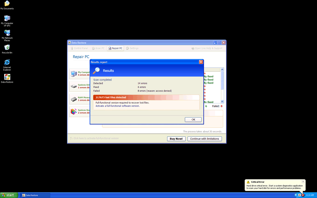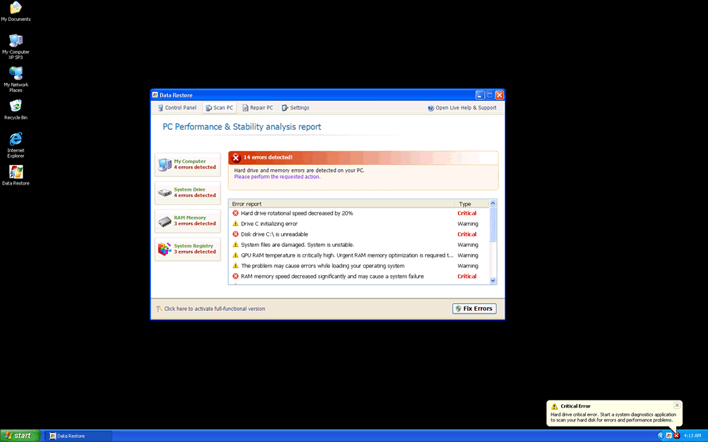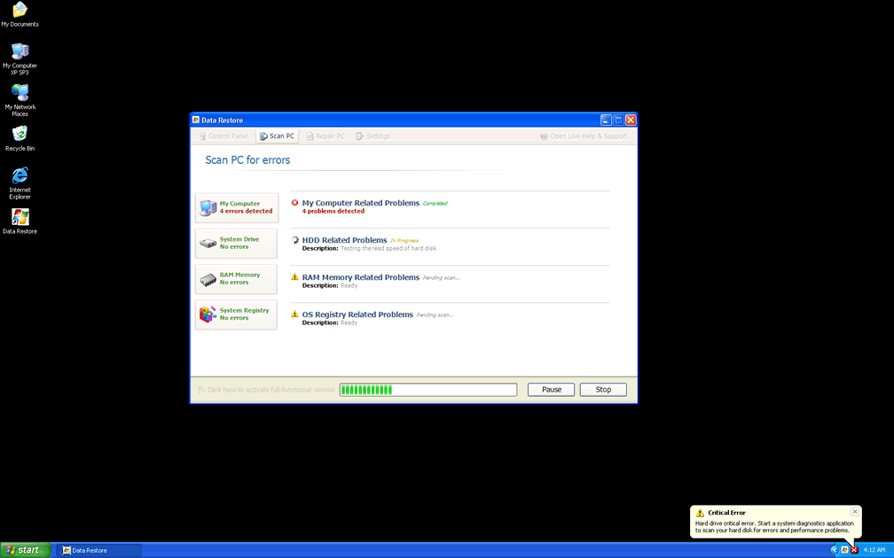 Unlike a real defragmenter or data recovery program, Data Restore doesn't offer real system-analysis features or any abilities that would help you maintain or preserve information on your PC. Despite this, Data Restore does look identical to a real defragger or other type of legitimate PC maintenance product, and even creates fake error messages to try to fool you about its capabilities. However, our malware analysts have found that Data Restore's fake errors are substantially less dangerous than its other functions, which are involved in attacking your PC in several different ways: