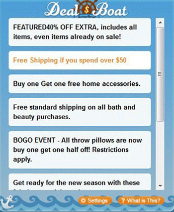 Deal Boat is a potentially unwanted program produced by 215 apps for Internet Explorer, Mozilla Firefox and Google Chrome that is typically added when computer users install other free software. Deal Boat will display advertisements, coupons and sponsored links via a pop-up box on Amazon, Walmart, Ebay and other shopping websites that Internet users are visiting. These pop-up advertisements will be illustrated as boxes, which contain numerous coupons that are available or as underlined keywords, which when clicked will show a pop-up advertisement that claims it is sent to the affected web user by Deal Boat. When web users install free software products, they will also install Deal Boat. Once installed, Deal Boat will show a box, which contains related keyword suggestions, ads and sponsored links, in the right top part of the hacked web browser, whenever the PC user will browse Facebook, Expedia, Best Buy or any other similar websites.