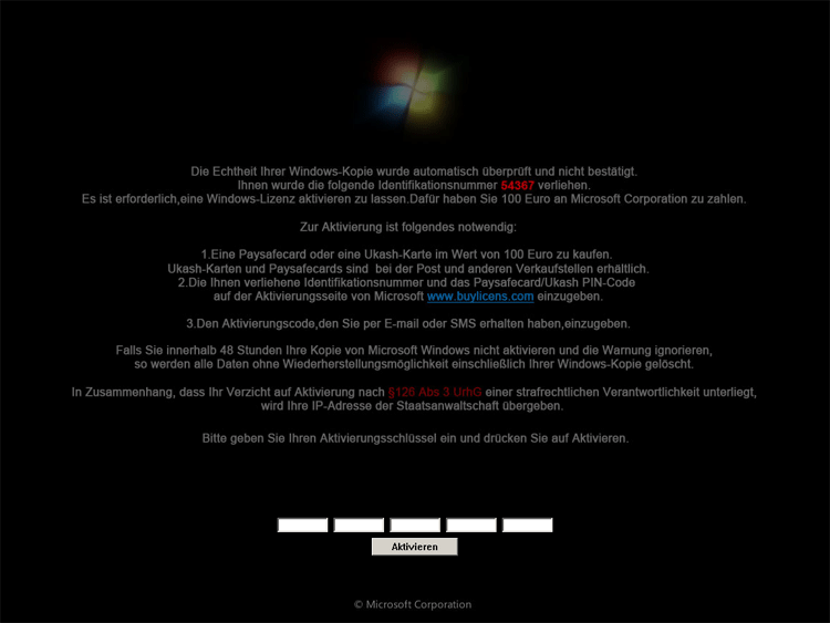 Although 'Die echtheit Ihrer Windows-Kopie' pretends to be from Microsoft, SpywareRemove.com malware researchers have found that 'Die echtheit Ihrer Windows-Kopie' is completely unaffiliated with any legitimate PC company, let alone the famous (or infamous) Microsoft. 'Die echtheit Ihrer Windows-Kopie' error messages are utilized by ransomware Trojans that specialize in locking down your computer until they milk their money's worth out of your wallet, and use alarming threats to back up this lock-down attack.