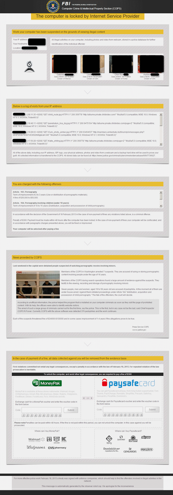 The most recent DirtyDecrypt attacks have spread out of Europe to other regions, including the US and Canada, and tend to trigger off of pornography site advertisements. These advertisements redirect their victims to illegal underage pornographic content and also use a variant of the Styx to install a member of DirtyDecrypt such as the 'Your Internet Service Provider is Blocked' Virus. Afterward, a fake police alert tailored to your IP address's geographical location is put on display and accuses your computer of being used to access the very same illegal content that was promoted by the original advertisement.
