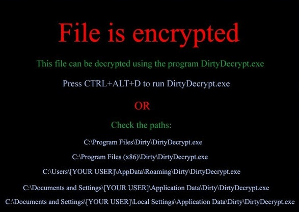 DirtyDecrypt is named for one of its earliest components, an EXE file that often is associated with file encryptor attacks. These attacks have been seen targeting Microsoft Office documents, general image files and Adobe PDF files and rendering them temporarily inaccessible – supposedly until a ransom is paid. New versions of DirtyDecrypt may or may include this attack, which is secondary to DirtyDecrypt's main goal of misinforming the victim about its purpose and acquiring money in the process.