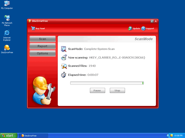DiscErrorFree is a fraudulent computer cleanup application. DiscErrorFree may be downloaded and installed onto your computer by a Trojan.Zlob that may sneak into your system via security cracks. As soon as in your system, DiscErrorFree will emulate a fake scan and display virus threat notifications. DiscErrorFree will then try to gull you out of your money by offering to sweep all of the parasites it "found" if you purchase the full version of the program. DiscErrorFree is a hoax and, therefore, should be removed from your machine without any hesitation.