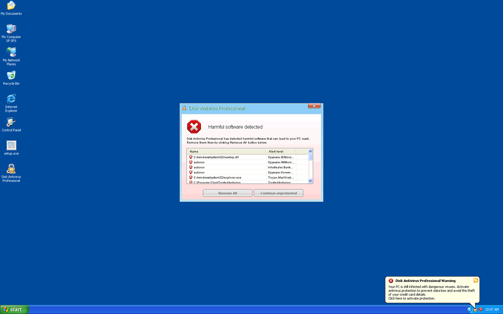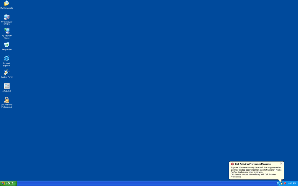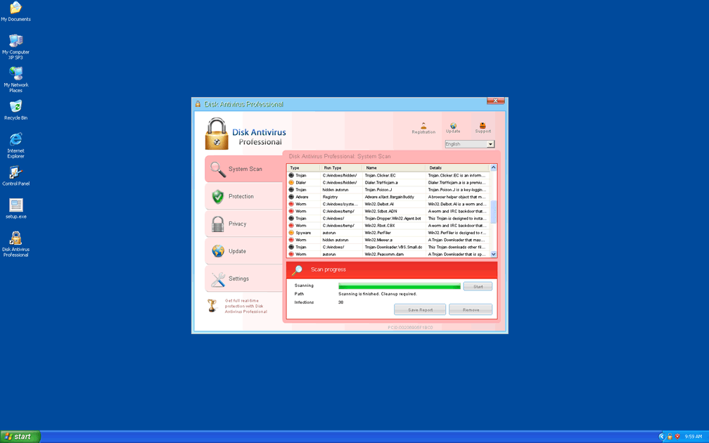 Disk Antivirus Professional is promoted in the form of an anti-virus program that appears to offer advanced virus-detection and removal features. Unfortunately, Disk Antivirus Professional actually isn't a match for even a minor brand of anti-virus software, let alone the products of major companies. While Disk Antivirus Professional can create a technical-looking system warning and may appear to scan your computer, Disk Antivirus Professional only fakes any detection of malware or attacks against your PC.