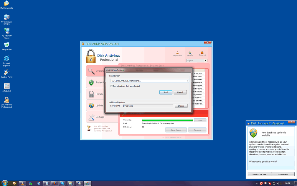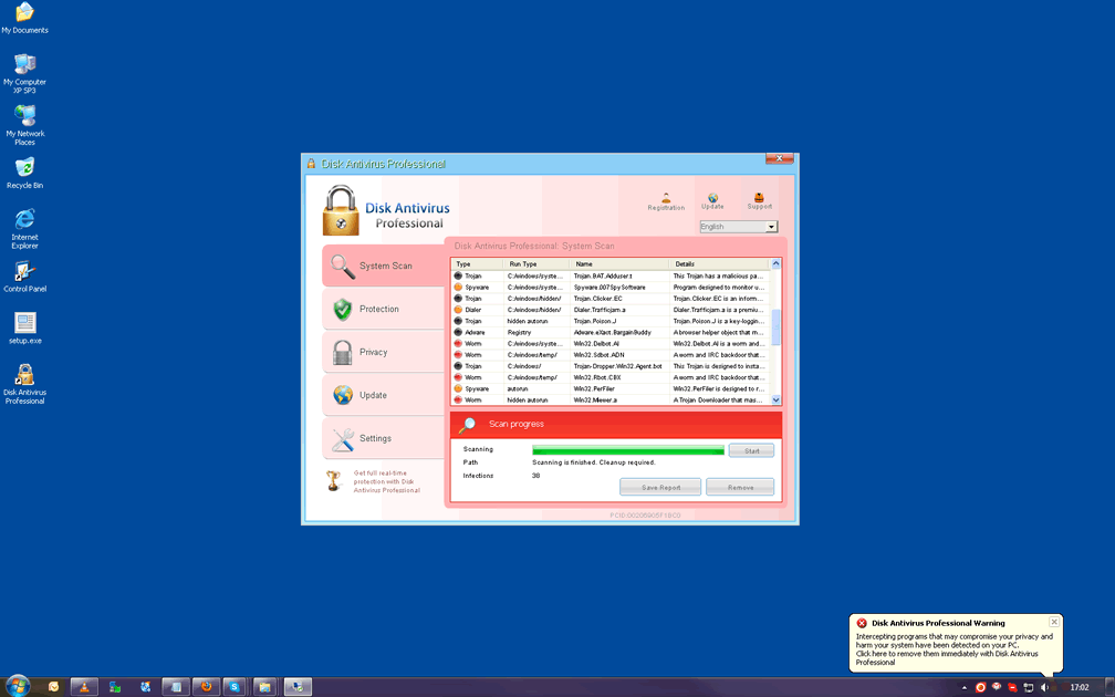 Intercepting programs that may compromise your privacy and harm your system have been detected on your PC. Click here to remove them immediately with Disk Antivirus Professional. |