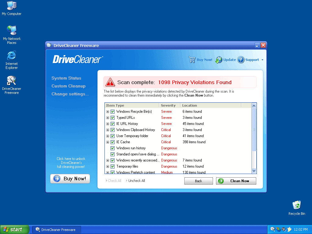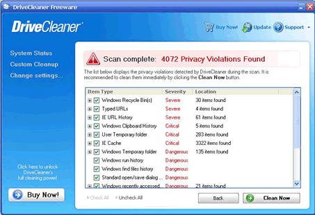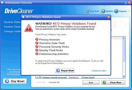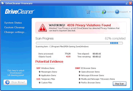 Drive Cleaner (or DriveCleaner) is a rogue anti-spyware program designed to pilfer money from unwary computer users. Once installed, DriveCleaner purposely wipes Internet tracks and removes cookies and temporary files. Drive Cleaner automatically runs when Windows starts-up. DriveCleaner spreads via corrupt advertisements and system exploits and is installed illegally. Drive Cleaner also displays false reports in order to market its licensed version. Remove DriveCleaner using a reliable anti-spyware program as soon as it has been detected.