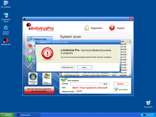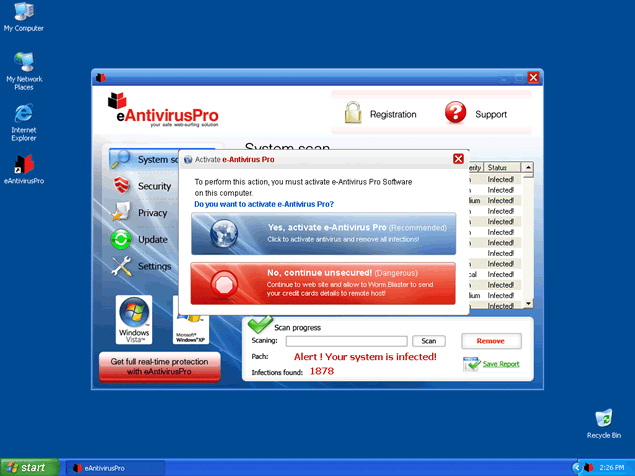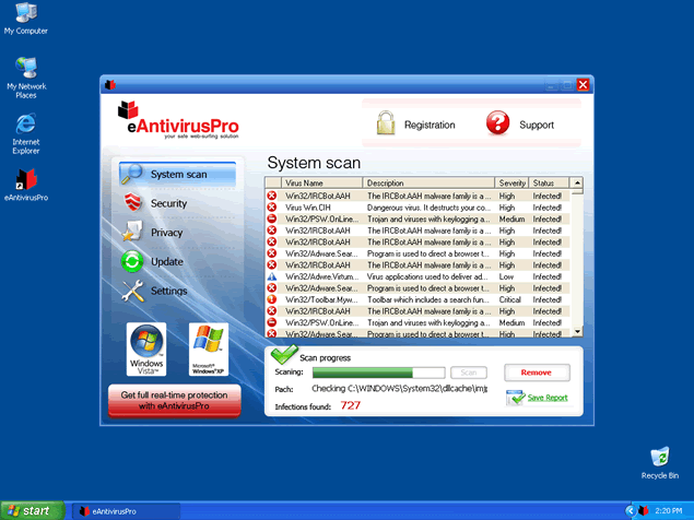eAntivirus Pro, also known as eAntivirusPro, is a rogue anti-spyware program that displays a fake icon on your system tray stating that your computer is infected with spyware. eAntivirus Pro will use fake security messages to urge you to download their software and will prompt you into purchasing the full version of eAntivirus Pro. eAntivirus Pro is a clone of Antivirus 2009.